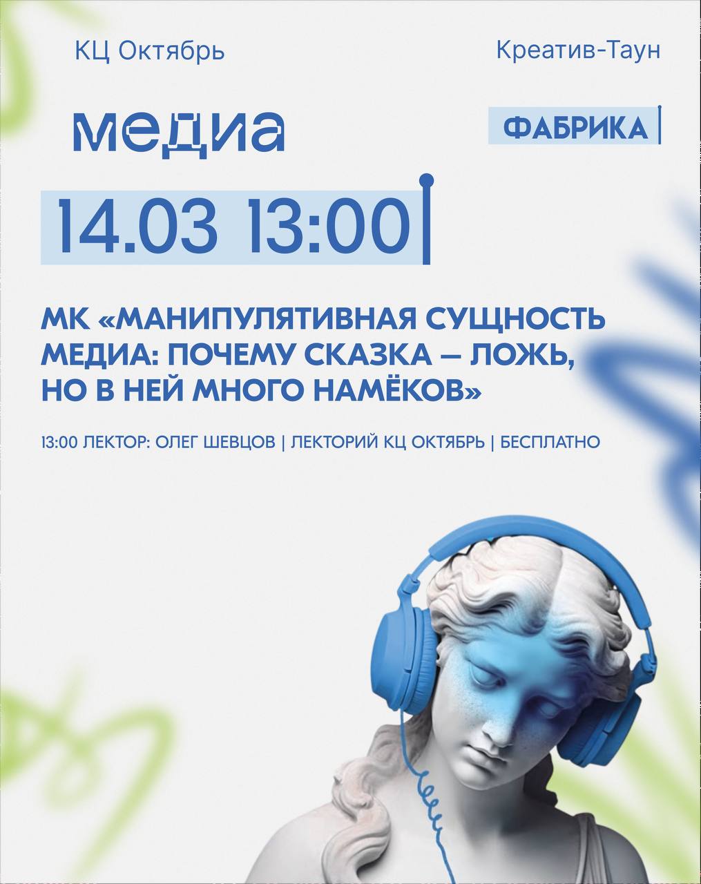 Тогда 14 марта в 13:00 ждём тебя в Лектории КЦ «Октябрь» на открытом мастер-классе «Манипулятивная сущность медиа: почему сказка – ложь, но в ней много намёков» от нашего творческого проекта «Медиафабрика»!