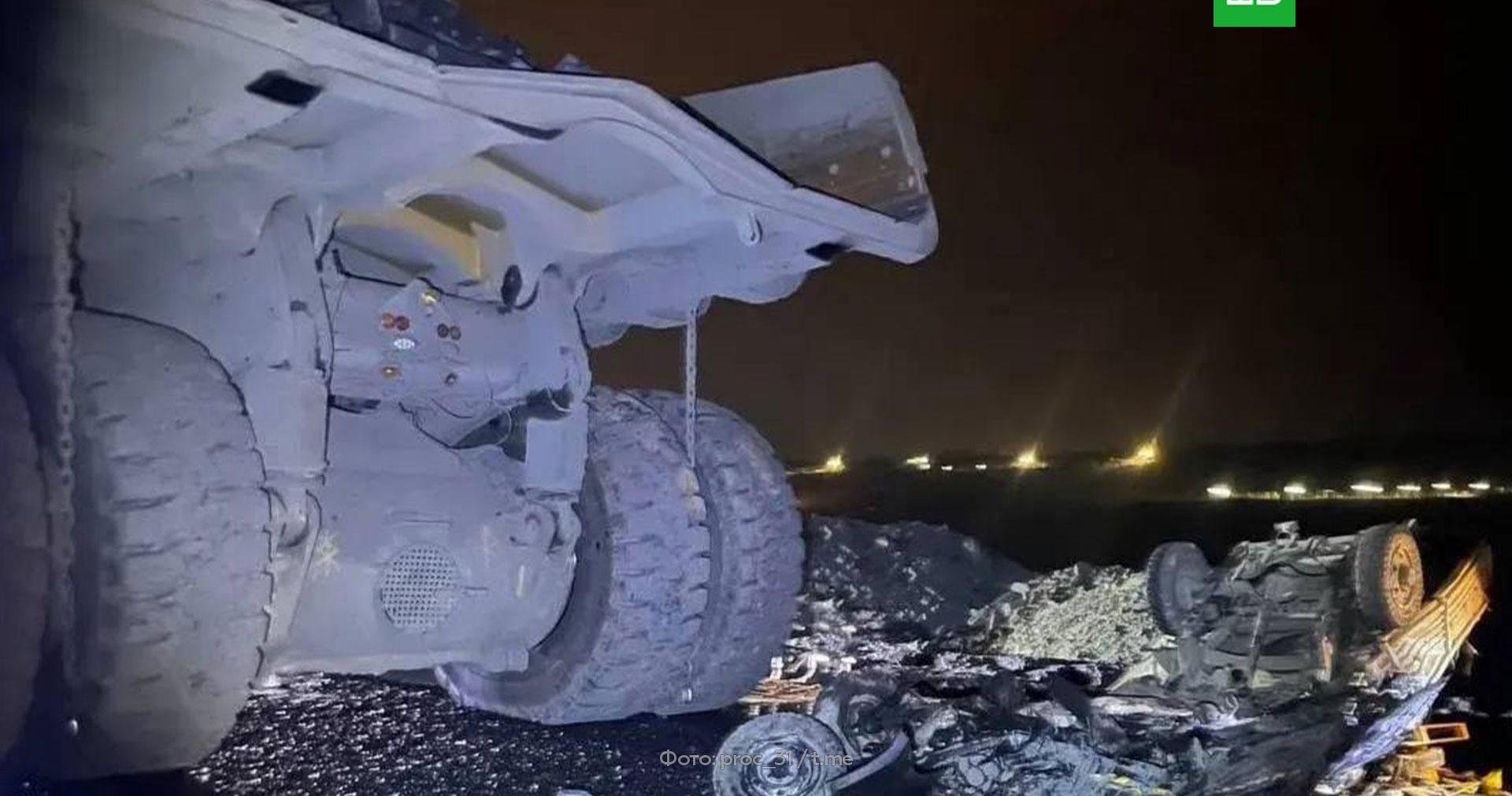 Самосвал переехал автомобиль «УАЗ» на карьере Лебединского горно-обогатительного комбината в Белгородской области.