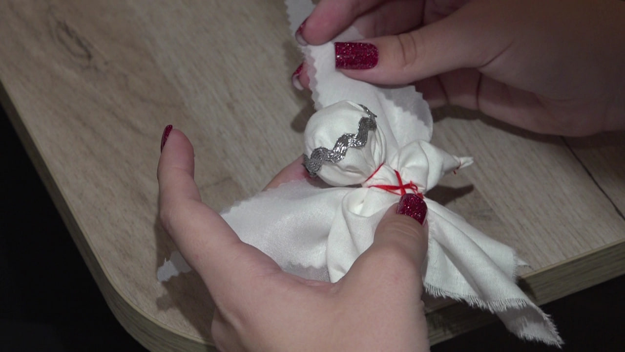 «Куколку мы изготавливаем – берём обязательно хлопчатобумажную ткань, вот такой вот квадратик хлопчатобумажной ткани, ещё нам нужно кусочек ватки и нитки красные. Потому что наша народная традиция – они вот почему-то делали обязательно из красной нитки», – рассказала педагог дополнительного образования Оксана Тарубарова.