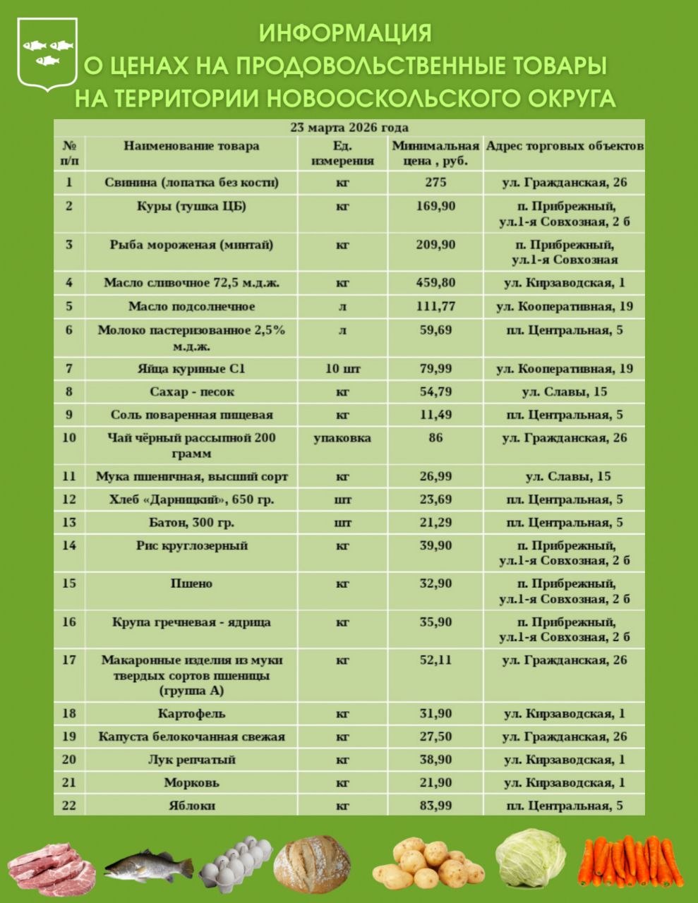 Продолжаю делиться актуальными ценами на социально значимые продукты питания. В представленной карточке собраны минимальные розничные цены на ключевые категории товаров, включая мясо, рыбу, яйца, крупы, молочную продукцию, хлеб и овощи. Также указаны адреса магазинов, где эти товары можно приобрести по обозначенной стоимости.