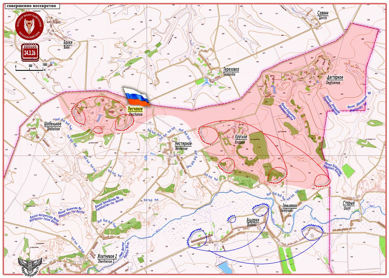 24 марта был установлен контроль над н.п. Песчаное (50°2541 с. ш. 37°2103 в. д. - население 28 чел. в 2001 г.).