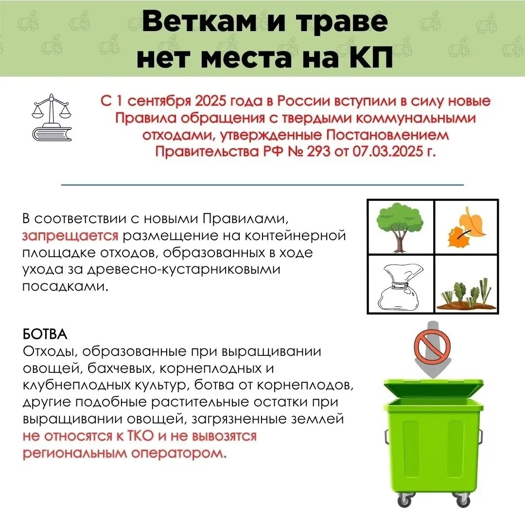 Напоминаем, запрещается складирование отходов, образовавшихся при уходе за древесно-кустарниковыми посадками (ветки, листва, поросль, спиленные деревья и кустарники) в местах (площадках) накопления твердых коммунальных отходов.