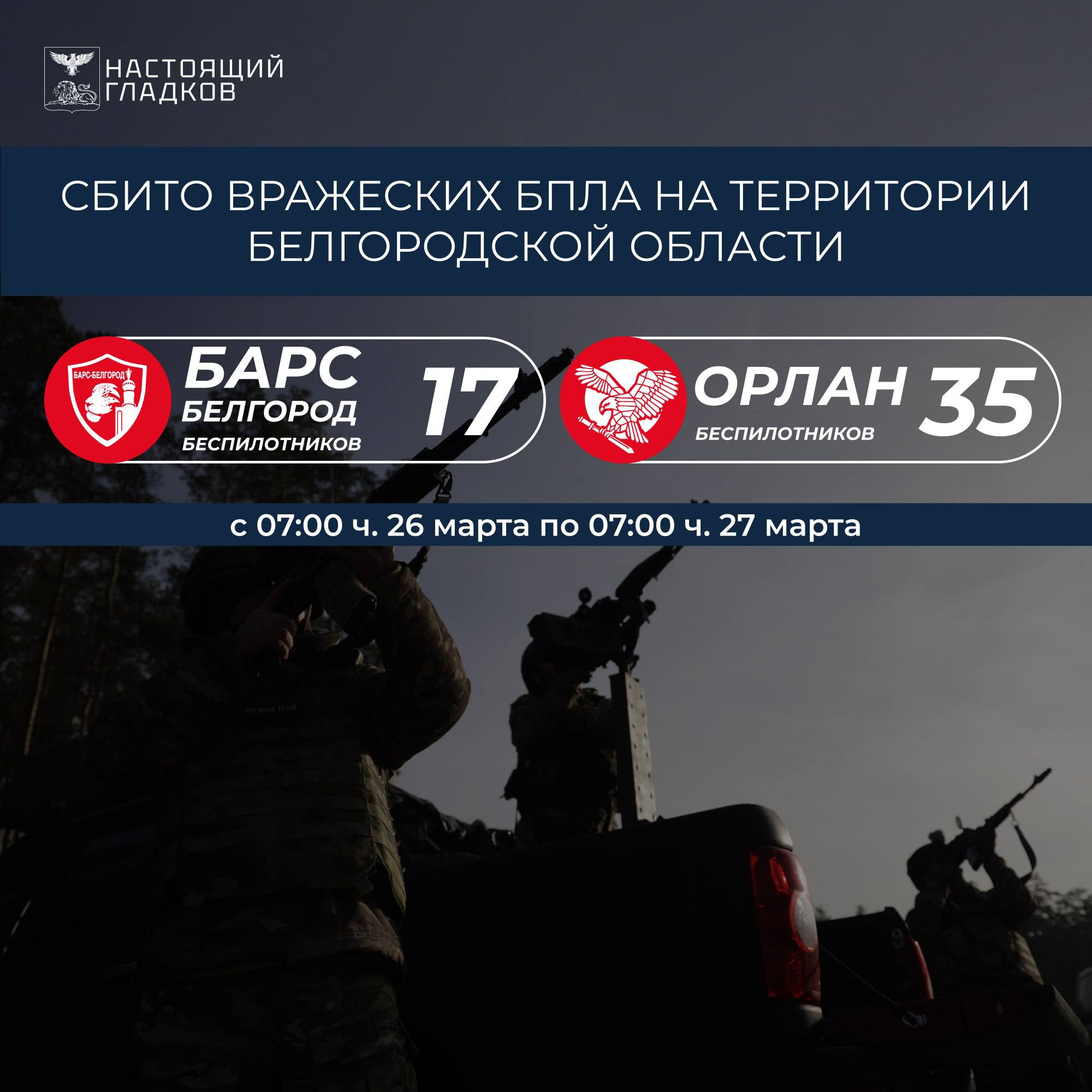 Информация о сбитиях всех типов вражеских БПЛА на территории Белгородской области подразделениями «БАРС-Белгород» и «Орлан»