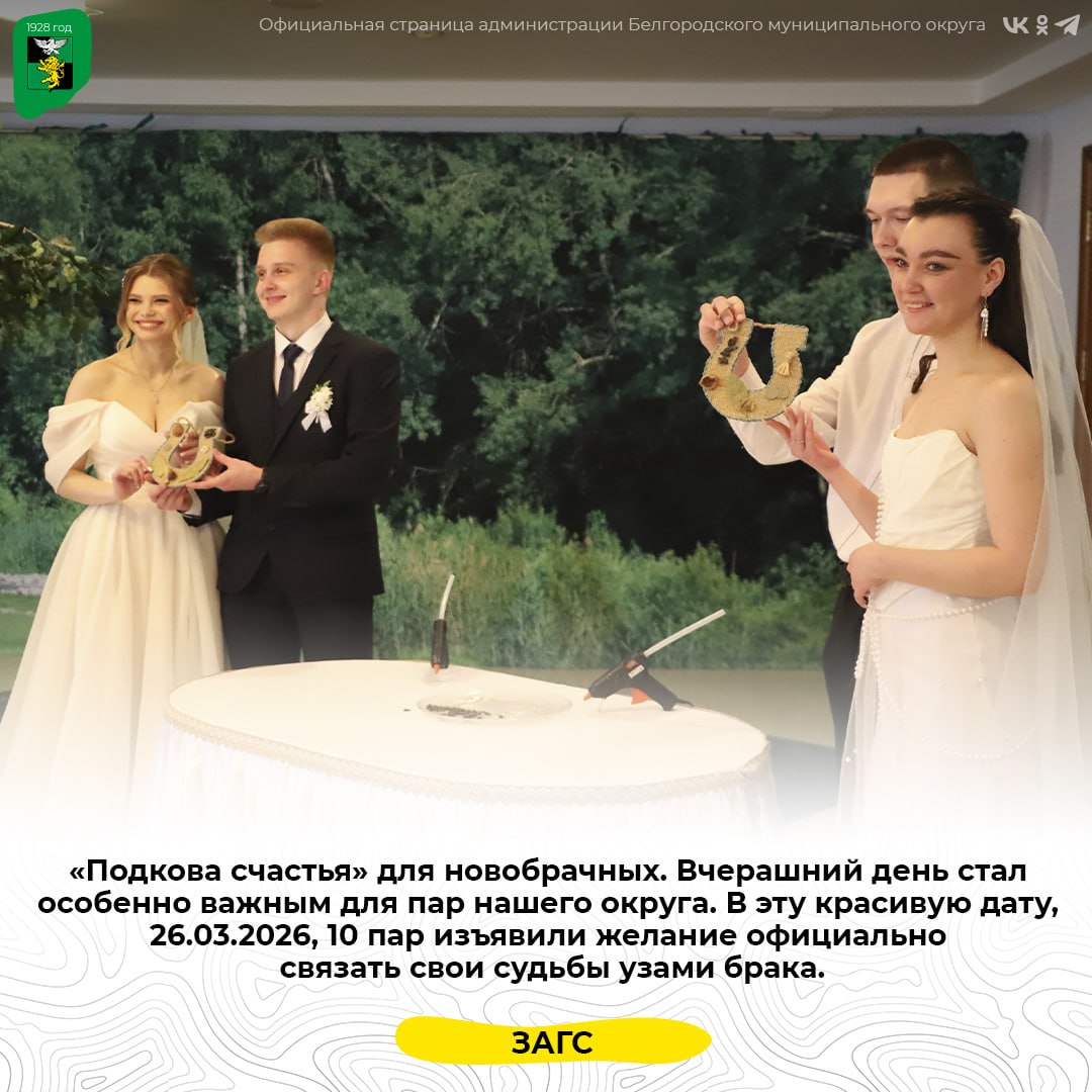Вчерашний день стал особенно важным для пар нашего округа. В эту красивую дату, 26.03.2026, 10 пар изъявили желание официально связать свои судьбы узами брака.