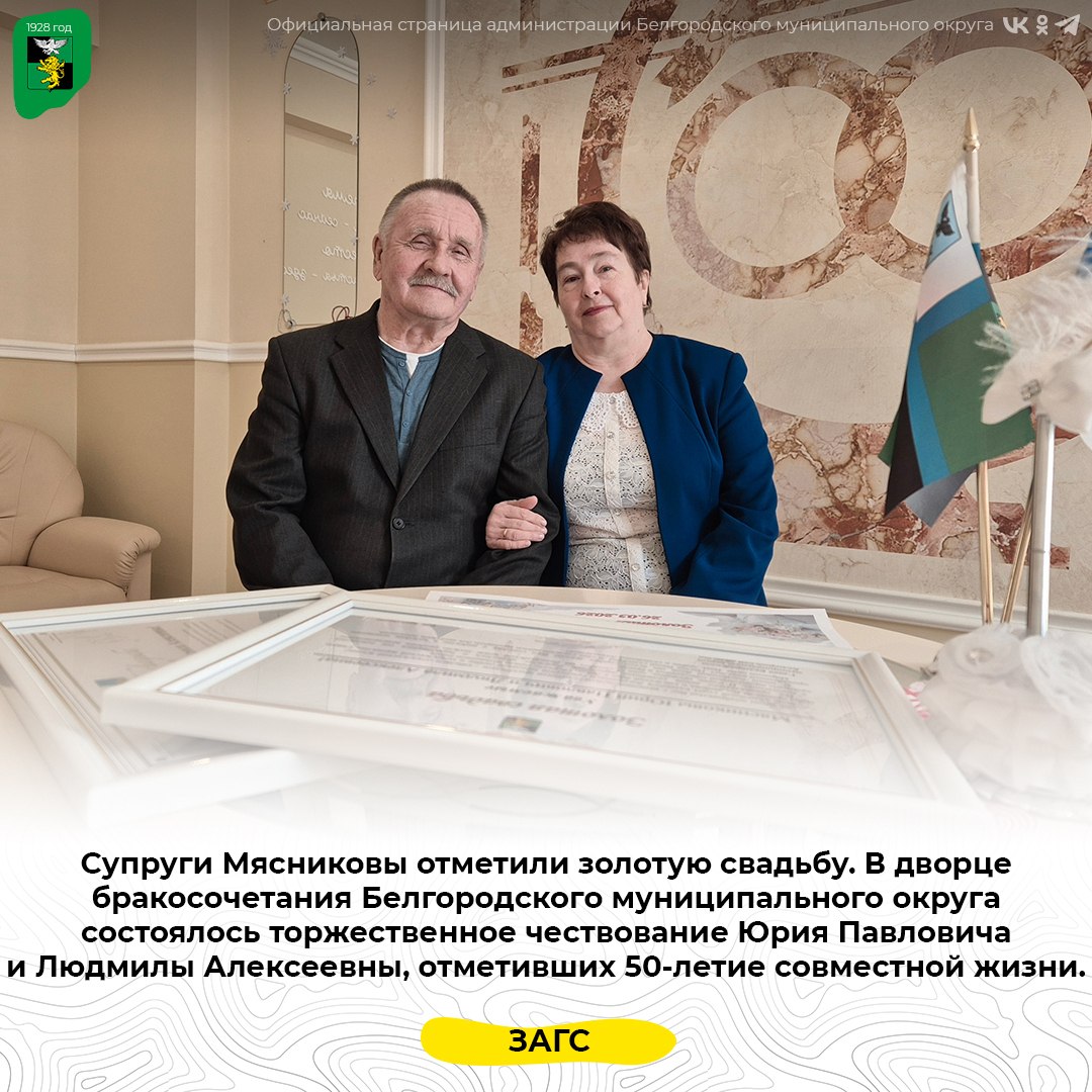 В дворце бракосочетания Белгородского муниципального округа состоялось торжественное чествование Юрия Павловича и Людмилы Алексеевны, отметивших 50-летие совместной жизни.
