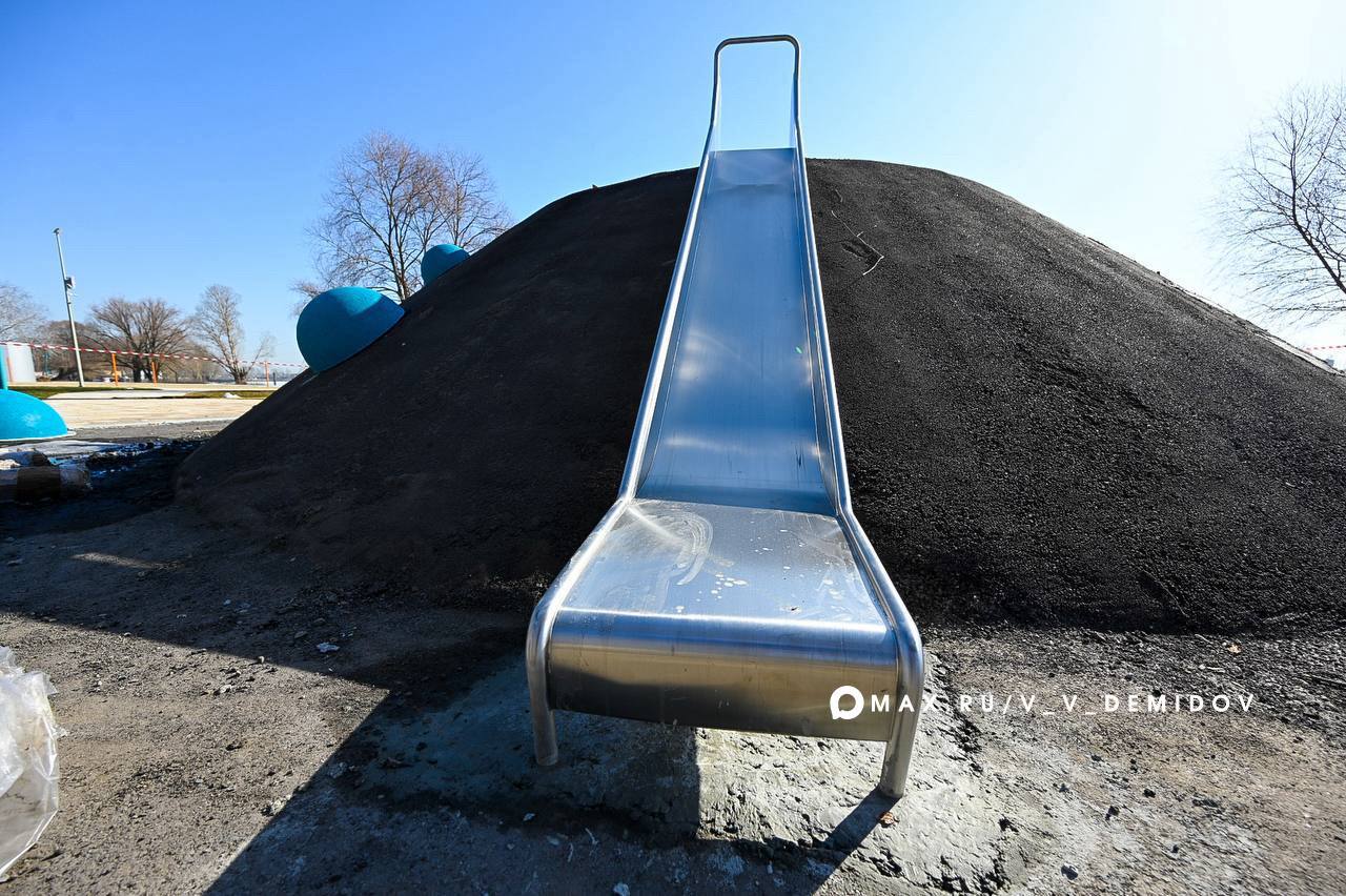 Её центральным элементом станет искусственный холм-скалодром. На нём есть лазательные элементы и трубоспуски, безопасные скатные поверхности.