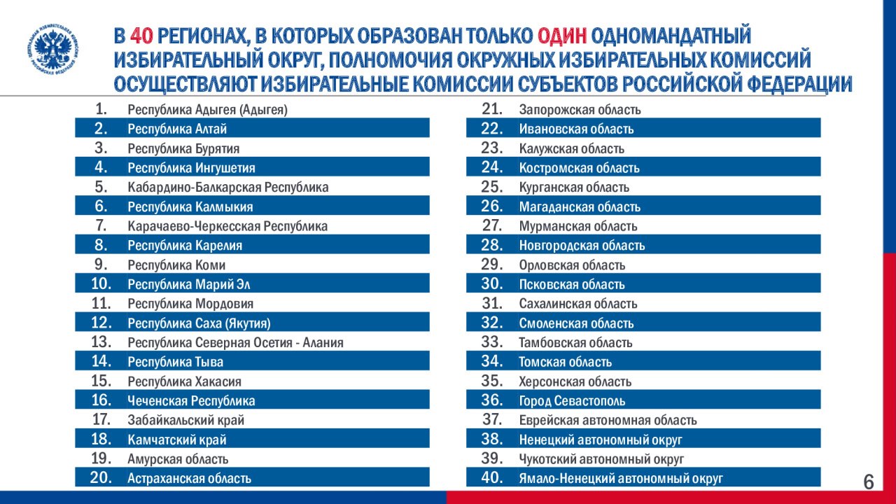В 40 регионах с единственным одномандатным округом полномочия окружной комиссии возлагаются на ИКС РФ.