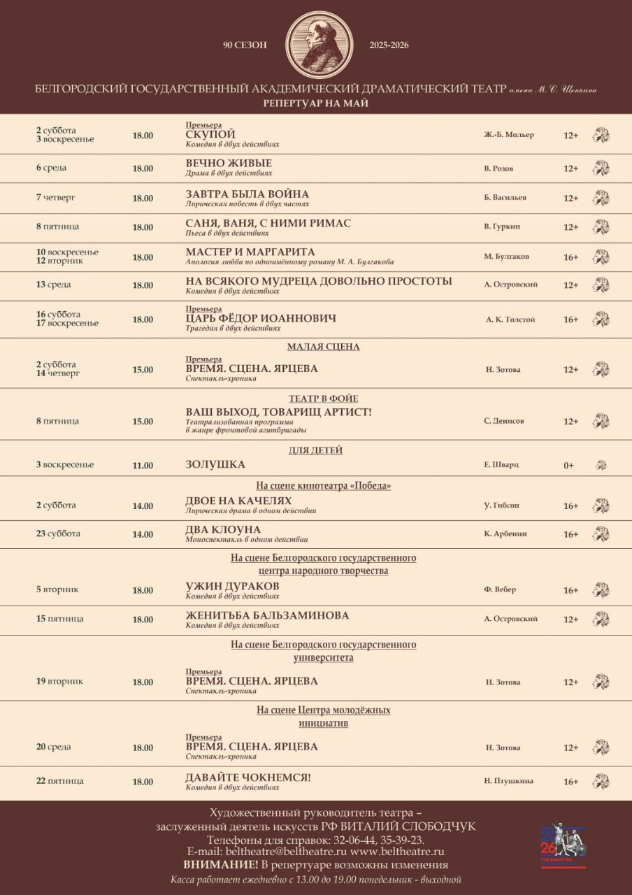 Завтра, 7 апреля, в 13:00 в Белгородском драмтеатре стартует продажа билетов на май. Приобрести их можно в кассе и на сайте.