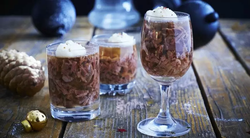 Холодец — это классика русской кухни, но как насчет того, чтобы поднести его в совершенно новом свете? Вместо традиционной подачи в глубоких тарелках, этот холодец восхитительно смотрится в коктейльных бокалах, создавая не только эстетическое удовольствие, но и удобство при подаче. Гости точно оценят такой креативный подход к знакомому блюду!