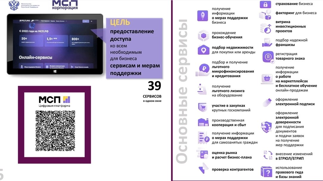 Министерством экономического развития Российской Федерации при активном участии самих предпринимателей разработана цифровая платформа МСП.РФ — государственная платформа для предпринимателей, самозанятых и тех, кто планирует начать свой бизнес, где собраны нужные сервисы, услуги и инструменты развития. Получить информацию о мерах государственной поддержки можно по QR-коду расположенного на слайде МСП корпорация, так по ссылке: https://clck.ru/3SzAAx