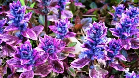 - Аюга: Этот почвопокровник известен также как живучка. Он прекрасно чувствует себя в тени и на солнце, его корни располагаются близко к поверхности, что исключает риск агрессивного роста. Период цветения — май и начало июня, когда сад наполняется сине-голубыми оттенками.