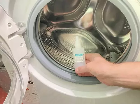 Первым этапом процесса является очистка барабана. Хлоргексидин подходит для этой цели идеально. Чтобы использовать его более удобно, можно перелить средство из оригинальной упаковки в распылитель. Это не только помогает сэкономить, но и упрощает нанесение.