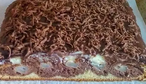 Пока пирог выпекается, можно заняться заварным кремом. Крахмал, муку и сахар смешивают, добавляют немного молока, размешивают до однородности, а после вливают в остальное молоко и доводят до густоты. Остывший крем взбивают вместе с мягким маслом до получения пышной массы. Готовый пирог покрывается заварным кремом, а после — шоколадной глазурью, приготовленной из сахара, какао и сметаны на водяной бане с добавлением масла для блеска.