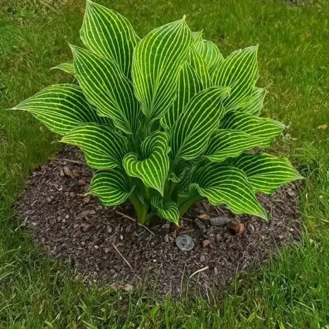 - Сибериан Тайгер (Hosta 'Siberian Tiger'): Этот сорт привлекает внимание своей оригинальной «тигристой» окраской. Лавандовые цветы распускаются в середине лета, а высота растения составляет 20–25 см — отлично подходит для бордюров и контейнеров.