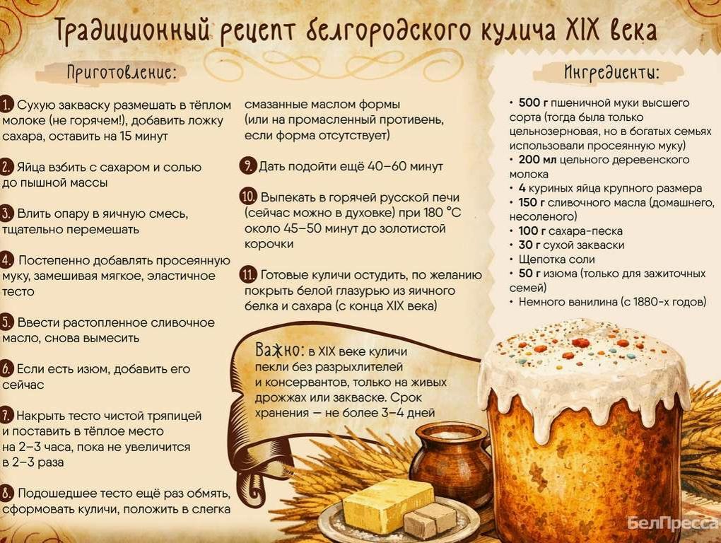 В его основе лежат записи из купеческих тетрадей Белгородской губернии и пропорции из главной кулинарной книги эпохи – «Подарок молодым хозяйкам» Елены Молоховец, изданной в 1861 году. Пекли куличи прапрабабушки без дрожжей, на живой закваске.