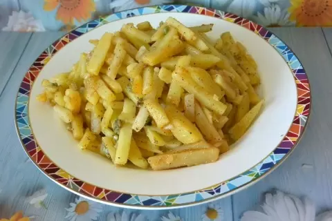 В сковороде раскаляем растительное масло и аккуратно ошпариваем картошку со специями. Все тщательно перемешиваем и оставляем остывать.