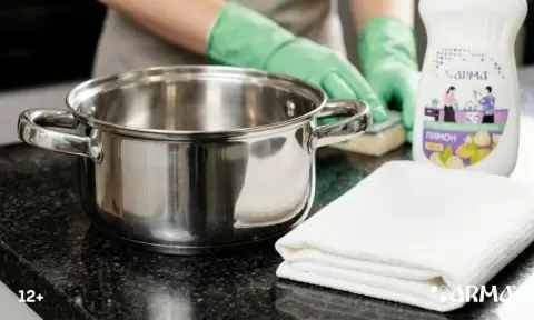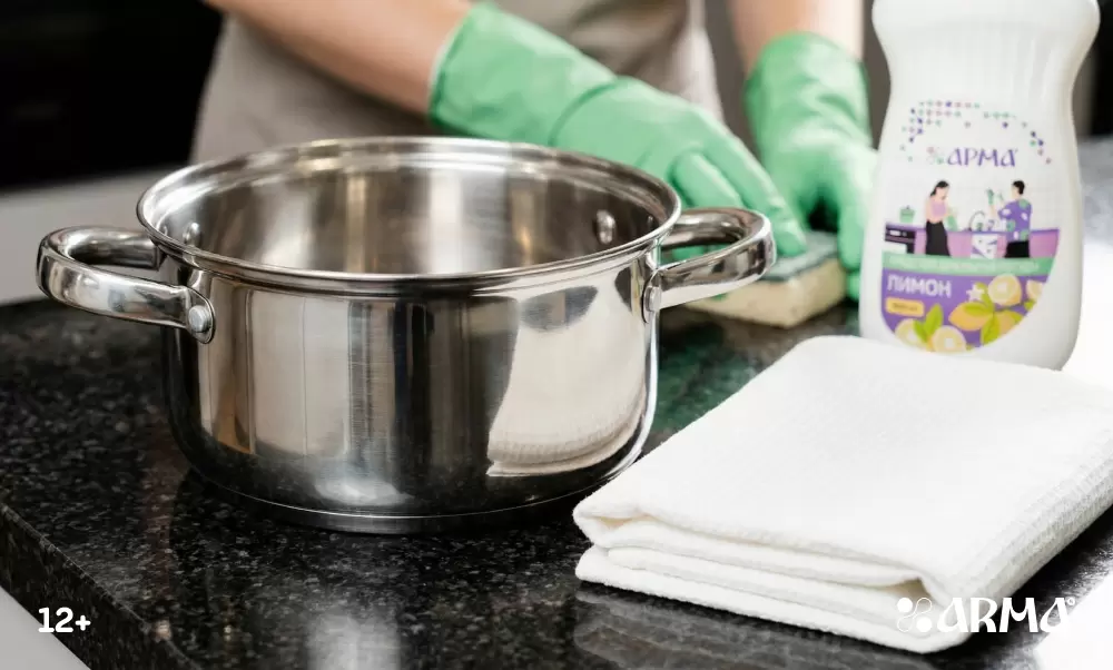 Рекомендация: выбирайте моющие средства по материалу. Для алюминия — мягкие нейтральные гели, для эмалевых кастрюль — избегайте средств с красителями, а для нержавеющей стали подойдут специальные очистители.