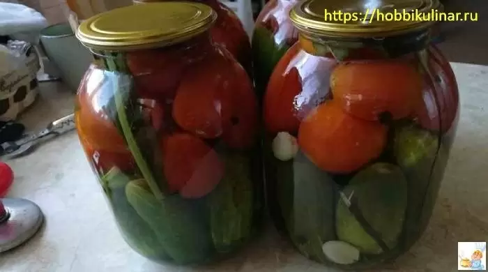 При подготовке нужно выбрать мелкие, неповрежденные помидоры и огурцы, тщательно их промыть и удалить плодоножки. Огурцы рекомендуется замочить в воде на несколько часов. Затем на дно подготовленных банок укладываются хрен, укроп и чеснок, после чего их заполняют овощами, максимально утрамбовывая их. В завершение заливается горячий маринад, банки герметично закатываются и переворачиваются для остывания. Хранить готовую закуску лучше всего в прохладном месте.