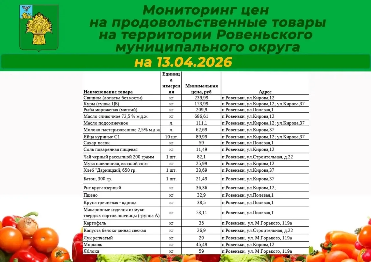 Делимся с вами подборкой цен на социально значимые продукты на территории Ровеньского муниципального округа по состоянию на 13 апреля 2026 года.