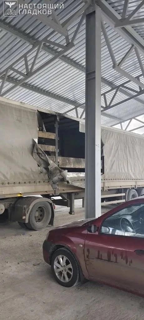 В здании повреждены остекление и фасад. Также осколками посечены два легковых автомобиля и социальный объект.