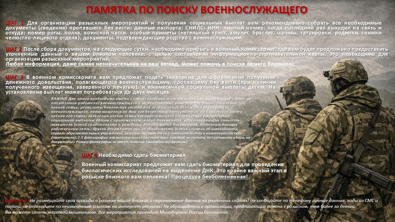 Делимся с вами памяткой, которая информирует о необходимости сдачи буккального эпителия по поиску военнослужащего, а также подскажет, какие шаги необходимо предпринять, если близкий человек, находящийся на СВО, длительное время не выходит на связь.