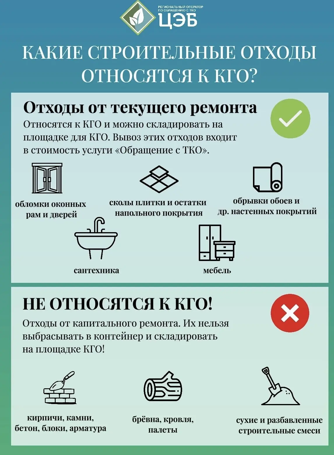 Согласно Федеральному закону №89-ФЗ «Об отходах производства и потребления», твердым коммунальным отходам относятся крупногабаритные отходы (КГО) – отходы, образующиеся в жилых помещениях в процессе использования физическими лицами, размер которых не позволяет осуществить их складирования в контейнерах (отслужившая мебель, большеразмерная бытовая техника, унитазы, ванны, двери, окна, куски обоев и линолеума, остатки лакокрасочных материалов и тд). Для сбора КГО существуют специально выделенные площадки.