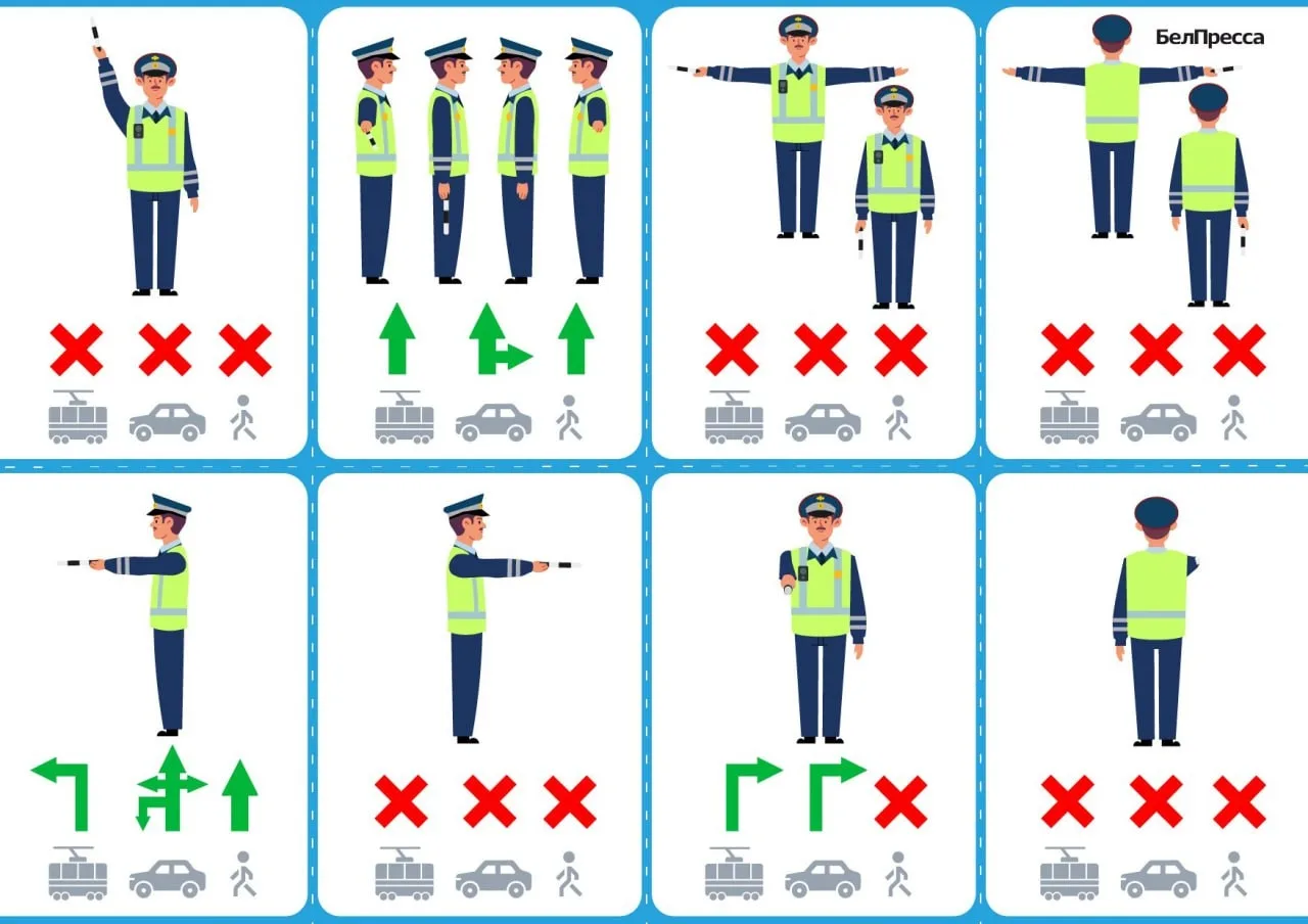 По словам очевидцев, пока водители пользуются знаками приоритета. Но не исключено, что на улицы выйдут регулировщики. На всякий случай напоминаем значение их жестов.