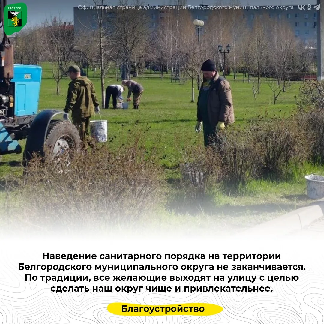 Большое внимание уделяется побелке деревьев и кустарников, а также озеленению парков, скверов и других общественных пространств. При этом не забывается о чистке дорог и тротуаров, а также вывозе мусора.