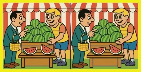 Перед вами два почти идентичных изображения: прилавок, усыпанный сочными арбузами. К ярким фруктам подходит мужчина в костюме, который что-то обсуждает со светловолосым продавцом. На первый взгляд сцены выглядят одинаковыми, но между ними скрываются три отличия. Установите таймер на 17 секунд и начните свой поиск прямо сейчас.