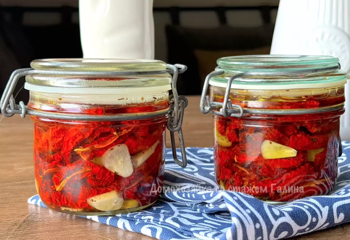 Как только помидоры высохли, их следует аккуратно укладывать в стерильные банки, чередуя с дольками чеснока. А чтобы добавить глубины вкусу, оливковое масло с прованскими травами прогревается на среднем огне и затем вливается в банки. Это создает невероятный аромат, который подчеркивает натуральный вкус вяленых томатов.