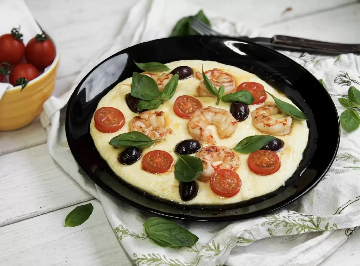 Шаг 4: Подавайте поленту на тарелках, украсив сверху креветками с маслинами и помидорами. Обязательно добавьте свежие ломтики базилика.