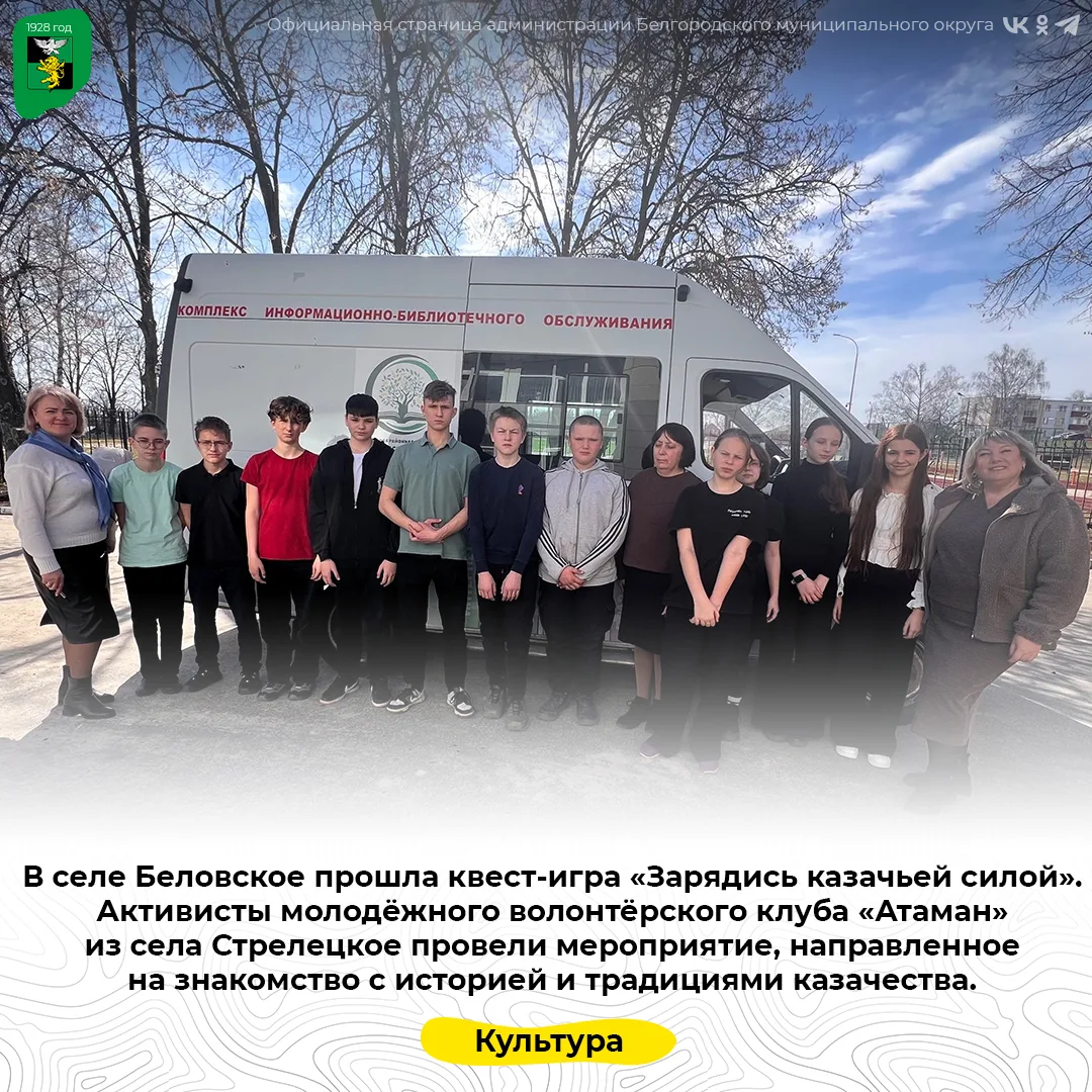 Работа молодёжного волонтёрского клуба «Атаман» и проведение выездных мероприятий на территории Белгородского округа реализуются в рамках грантового проекта «Фестиваль казачьей и стрелецкой культуры приграничных территорий «Гойда» при поддержке Президентского фонда культурных инициатив.
