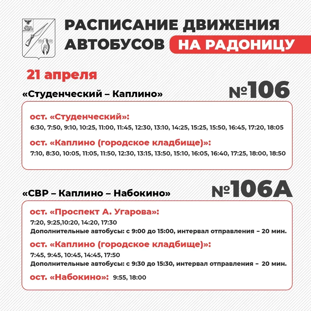 В день Радоницы, 21 апреля, для вашего удобства будут работать дополнительные маршруты движения общественного транспорта «Студенческий — Каплино» и «СВР — Каплино — Набокино».