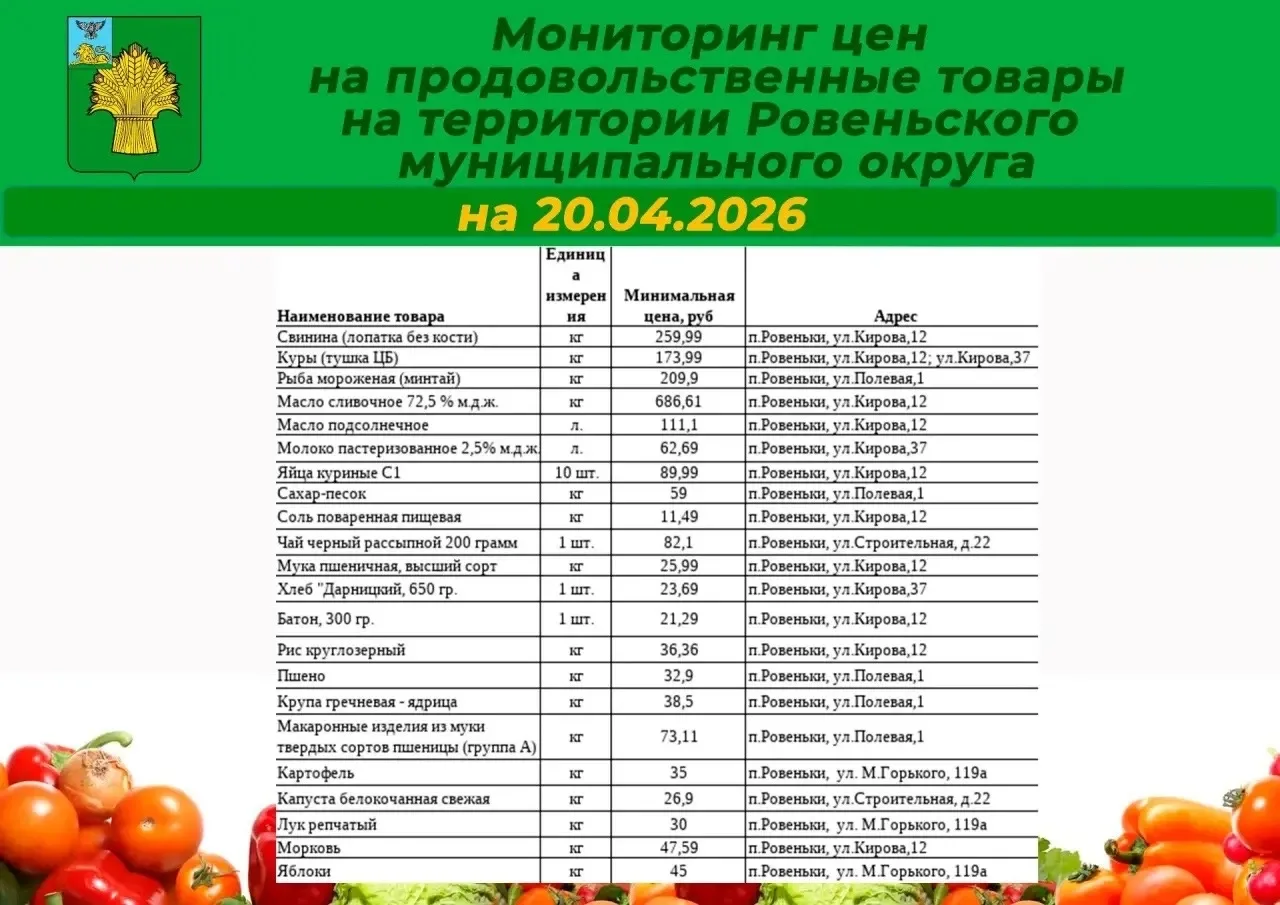 Делимся с вами подборкой цен на социально значимые продукты на территории Ровеньского муниципального округа по состоянию на 20 апреля 2026 года.