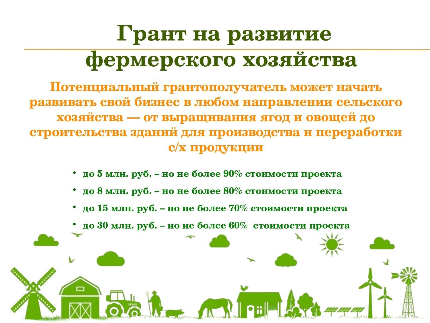 Грант направлен на существенное укрепление и развитие вашего фермерского бизнеса. Основные направления поддержки включают:приобретение земель сельскохозяйственного назначения, строительство современных зданий для производства, хранения первичной и последующей переработки сельскохозяйственной продукции. Приобретение и монтаж готовых решений для хранения и переработки, что позволит быстро запустить необходимые процессы. Комплектация помещений всем необходимым оборудованием для эффективного производства. Обеспечение зданий необходимыми инженерными сетями. Инвестиции в энергоэффективность и автономность вашего хозяйства. Грантополучатели прошлых лет не могут участвовать в конкурсе на получение гранта в этом году.