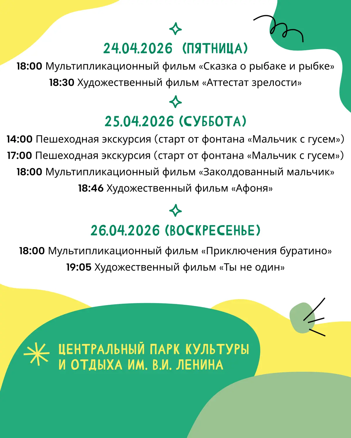 Заходите на кинопоказы в Центральный парк культуры и отдыха им. В. И. Ленина.