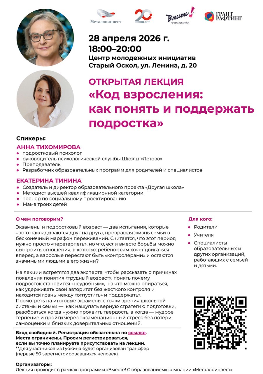 В рамках реализации программы «Вместе! С образованием» компании «Металлоинвест» в Центре молодёжных инициатив состоится открытая лекция «Код взросления: как понять и поддержать подростка».