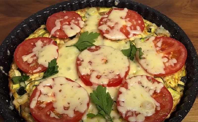 Затем смазать форму для выпечки маслом и выложить кабачковую массу равномерным слоем. Выпекать в духовке, разогретой до 180 °C, 35–40 минут. После этого добавить тонкие ломтики помидора и посыпать натертым сыром, вернуть запеканку в духовку еще на 7 минут для золотистой корочки.