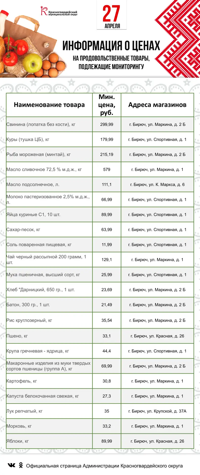 Представляем информацию о минимальных ценах набора социально значимых товаров первой необходимости по состоянию на 27 апреля