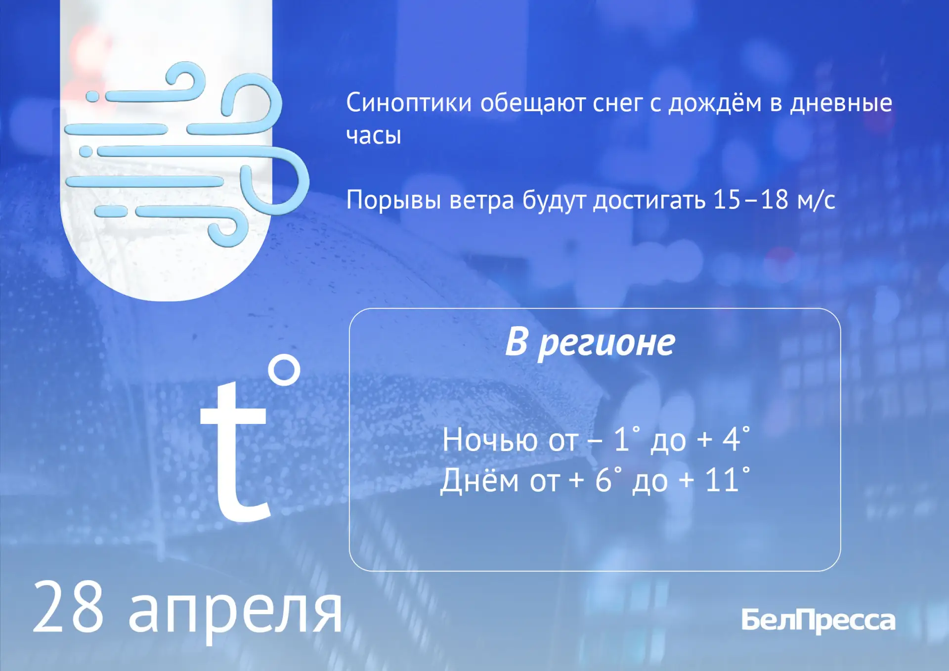 Синоптики прогнозируют снег с дождём и сильный ветер западного направления. Осадки пройдут повсеместно.