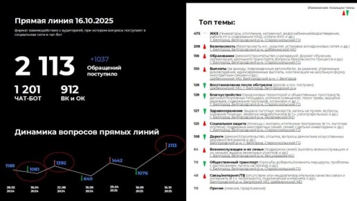 Это в два раза больше, чем на прямую линию, которую Вячеслав Гладков проводил месяц назад, прокомментировала министр общественных коммуникаций Оксана Тарантова. Увеличение связано с запуском работы специального чат-бота для приёма обращений от...